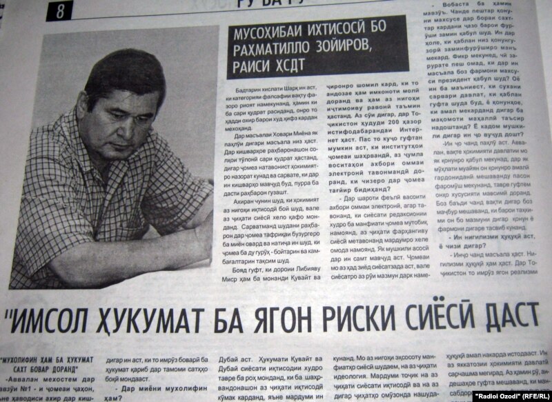 "Озодагон" мусоҳибаеро бо Раҳматулло Зойиров, раҳбари Ҳизби состсиал-демократи Тоҷикистон нашр кардааст. Вай гуфта, ки "имсол ҳукумат ба ягон риски сиёсӣ даст намезанад" ва ҳамзамон афзудааст, "то имрӯз бовар ба ҳукумат қариб дар тамоми самтҳо боқӣ мондааст. Ҳатто дар сафи оппозитсияи тоҷик боварии аз ҳад зиёд ба ҳукумат дар сатҳи баланд аст ва ҳатто ба ҳукумат такя мекунанд."