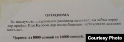 Аз сокинони шаҳри Душанбе хоста шудааст, ки чорвои худро дар рӯзи Иди Қурбон дар назди баландошёнаҳо забҳ накунанд. Вагарна аз 8 то 16 ҳазор сомонӣ, муодили тақрибан аз ҳазор то ду ҳазор доллар, ҷарима хоҳанд шуд. Ин огоҳӣ бо имзои раҳбарияти ширкати “Манзилхидматрасон”-и пойтахт дар аксари биноҳо насб шудааст.