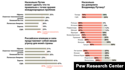 Дар ҷаҳон ба президент Владимир Путин чӣ гуна муносибат мекунанд? Дар Аврупо 78 дарсади пурсидашудаҳо нобоварии худро ба Путин баён доштанд. 89 дарсад лаҳистониҳо, 88 дарсад испаниҳо, 87% ҳолландиҳо, 87% шведҳо ва 80% фаронсавиҳо ба ин назаранд, ки Путин дар равобити байналмилалӣ дуруст рафтор намекунад.