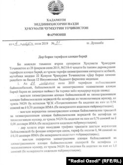 Фармони Хадамоти зиддиинҳисорӣ “Дар бораи таъруфаҳои алоқаи барқӣ”, ки нусхаи он дар ихтиёри Радиои Озодӣ аст, 27-уми март ба иҷро медарояд. Дар ҳоли ҳозир 1 гигабайт Интернет ба ҳисоби миёна 30-35-сомонӣ арзиш дорад.