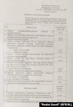 Қарори афзоиши нархи нирӯи барқ рӯзи 25-уми сентябр аз тарафи ҳукумати Тоҷикистон содир шудааст. Бар асоси ин санад, ки рӯзи 2-юми октябр дастраси Радиои Озодӣ гардид, аҳолии Тоҷикистон аз якуми ноябр барои ҳар киловат соат нерӯи барқ 19,37 дирам пардохт хоҳанд кард. То ин вақт ҳар киловат соат нерӯи барқ барои аҳолӣ 16,85 дирам арзиш дошт.
