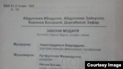 Китоби «Забони модарӣ» барои синфи 3-ро дар таҳияи 4 муаллиф - Абдуллоев Ибодулло, Абдуллоев Зайнулло, Бозоралӣ Боронов ва Зафар Дорғабеков ва зери таҳрири забоншиноси маъруф Баҳриддин Камолиддинов ба нашр расидааст. Мушовирони нашри ин китоб академик Маҳмадулло Лутфуллоев ва шоири маъруф Низом Қосим будаанд.