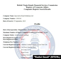 Радиои Озодӣ бо пардохти наздик ба 100 евро боҷи расмӣ аз ин минтақа дар бораи IRS маълумот хост. Дар санаде, ки аз ин Феҳрасти ягонаи шахсони ҳуқуқии Ҷазираҳои Вирҷиния дастраси Радиои Озодӣ шуд, маълум гашт, IRS рӯзи 30-юми сентябри соли 2008 таҳти рақами 1505181 сабти ном шудааст. Ҳадди аксари шумораи саҳмияҳои ин ширкат 50 ҳазор дона аст ва IRS - Инновейтив Роуд Солюшнз бо миёравии агент - Алеман Кордеро Галиндо сабти ном шудааст.